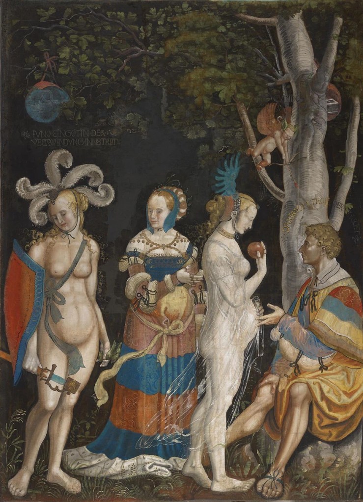 En la imagen aparecen, Hera, desnuda, solo cubierta con una cinta azulada que le rodea el torso del hombro izquierdo a la cadera derecha y uno de cuyos extremos le cubre el pubis, ataviada con un sombrero de plumas típico de los lansquenetes y con un escudo y una espada en el brazo derecho; Atenea, vestida con cofia y rico vestido a la moda contemporánea de la época en que fue realizado el cuadro; Afrodita, de perfil vestida con un velo transparente y tocada con una cofia alada, que ya sujeta en la mano derecha la manzana de la discordia; y Paris, sentado sobre una roca, vestido también con prendas contemporáneas, que se la acaba de ofrecer, por lo que en realidad el juicio acaba de suceder.