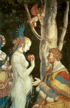 Entre las ramas del árbol de la derecha aparece Cupido, como un pequeño niño alado con los ojos cubiertos por una venda, sujetando un arco y una flecha.