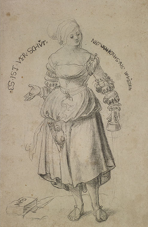 Some characters are identified with legends written on their heads: PARIS VON TROY DER TORECHT (Paris of Troy the fool), IUNO EIN GÖTTIN DER ÜBERWINDUNG INN STRITS (Juno, the goddess who wins in disputes) —Juno is the Roman version of Hera -; FENUS FENUS (Venus, the Roman version of Aphrodite); and CUPIDO.