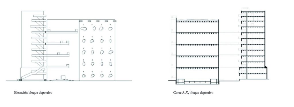 Visto; unidos entre sí por varias pasarelas, el edificio de mayor tamaño acoge una piscina y cuatro pabellones de deporte en varias plantas superpuestas.