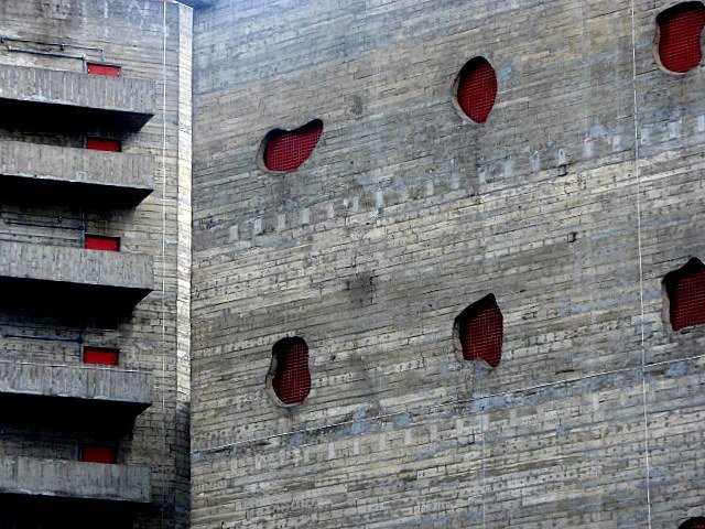 El revestimiento rojo de las rejas tras las ventanas de formas libres indica que aquí ya no se llevan a cabo tareas industriales.