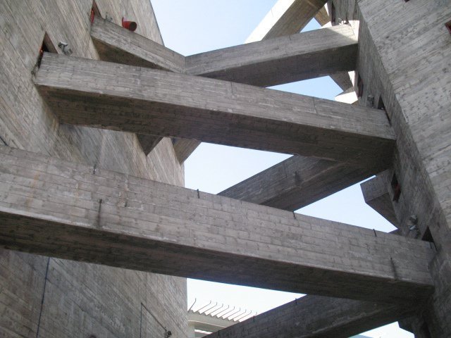 Encima, dos poderosos estribos de hormigón rojo sujetan un cuerpo arquitectónico accesorio en suspensión.