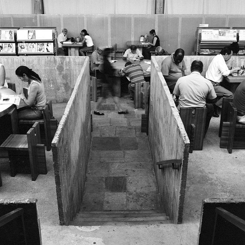 La arquitectura es creada, «inventada de nuevo», por cada hombre que anda en ella, que recorre su espacio, subiendo las escaleras, o descansando sobre una barandilla, levantando la cabeza para oler, abrir o cerrar una puerta, sentarse o levantarse a tener un contacto íntimo y al mismo tiempo crear «formas» en el espacio; el ritual primitivo desde el cual surge la danza, la primera expresión de lo que sería el drama. Este contacto íntimo, ardiente, que una vez fue percibido por el hombre, está ahora en el olvido. Los lugares habituales y comunes hicieron al hombre olvidar la belleza de su «movimiento en el espacio», su movimiento consciente, de mínimos gestos, de menos actitud…– Lina Bo Bardi
