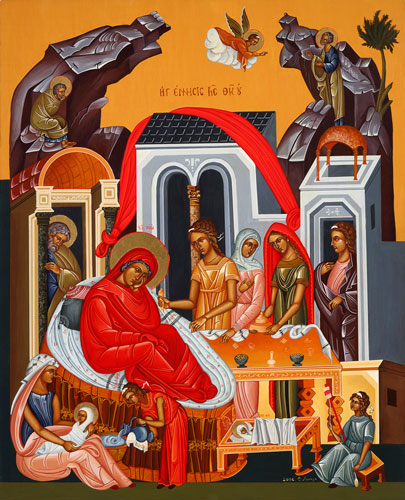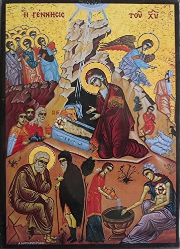 The scene is completed with the child in a kind of manger altar typical of Byzantine representations, Saint Joseph and the midwife Salome, who when examining Mary to check her virginity, remains charred, when she touches the virgin with her finger.