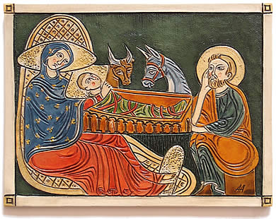 Wood, frescoes or illuminated miniatures are also used to represent the Nativity.