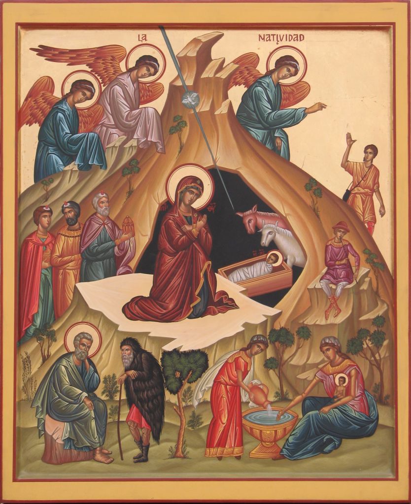 El paisaje de la Natividad en Bizancio, las figuras están en una gruta situada en un entorno montañoso, con un establo, cobertizo, pesebre o ruinas.