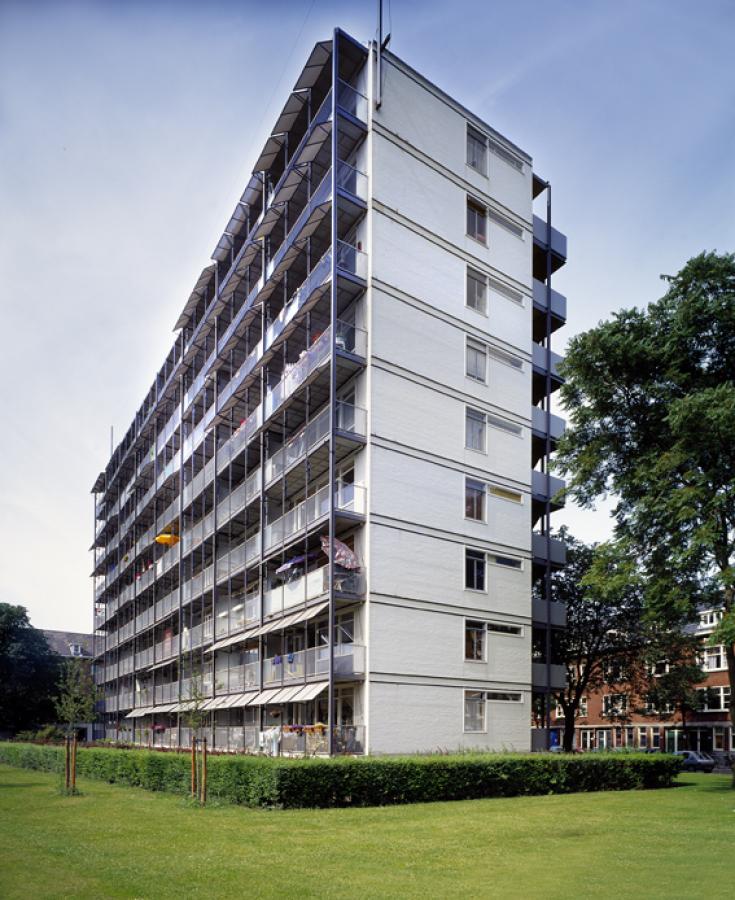Las viviendas del rascacielos discoidal de obreros Bergpolder en Róterdam (1933-1934, en colaboración con Willem van Tijen) se abren a galerías.