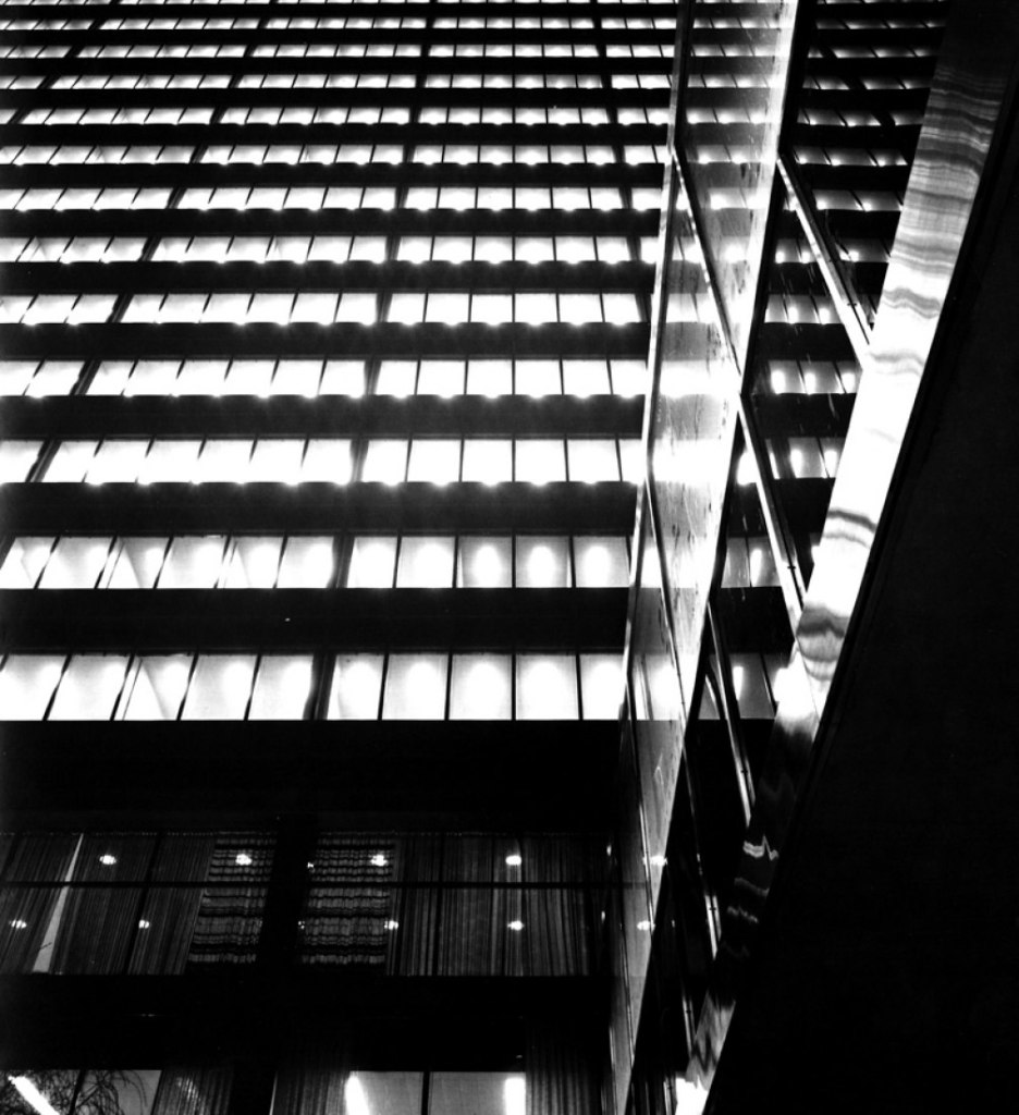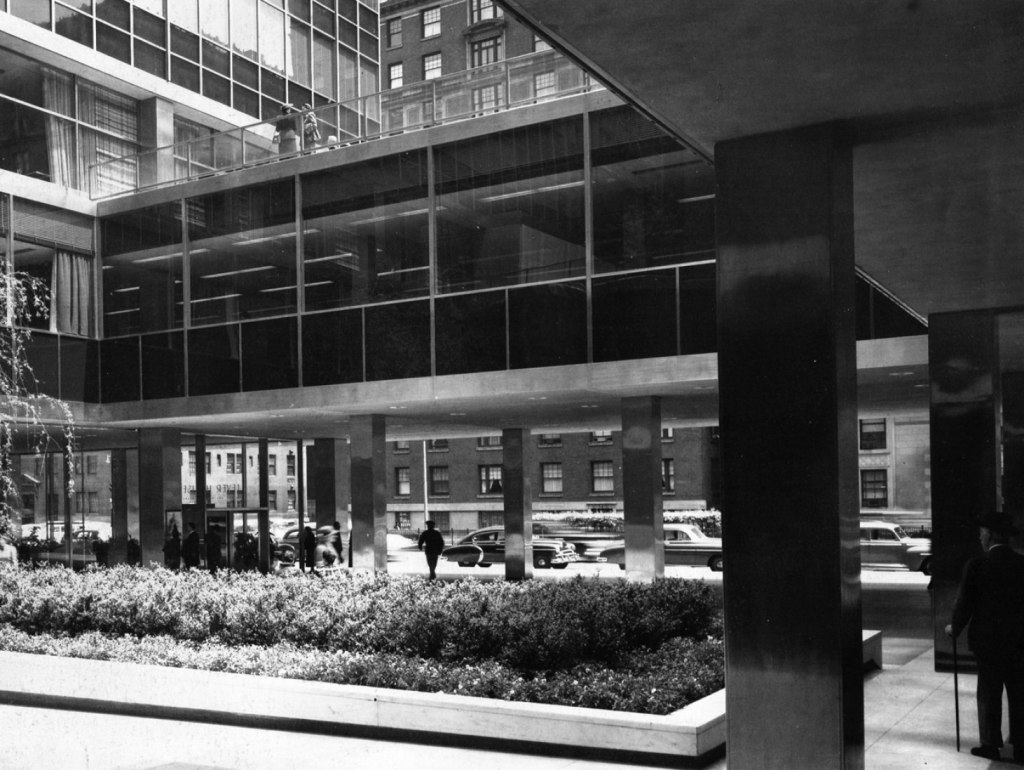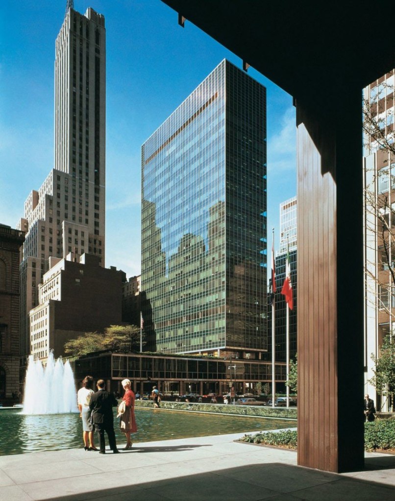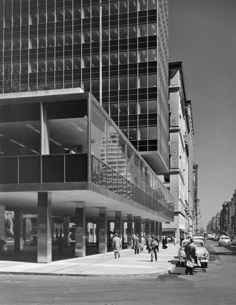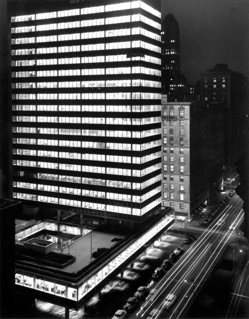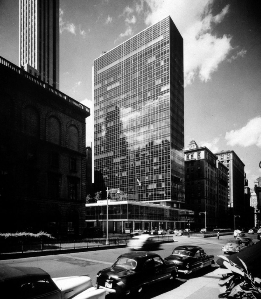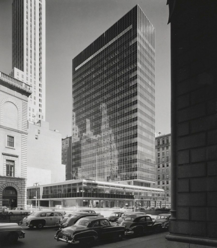 El edificio administrativo de 21 plantas de la Lever Brothers Company en Nueva York (1951-1952), un rascacielos con fachada de muro cortina sobre base plana, representa un nuevo prototipo de los edificios comerciales urbanos.