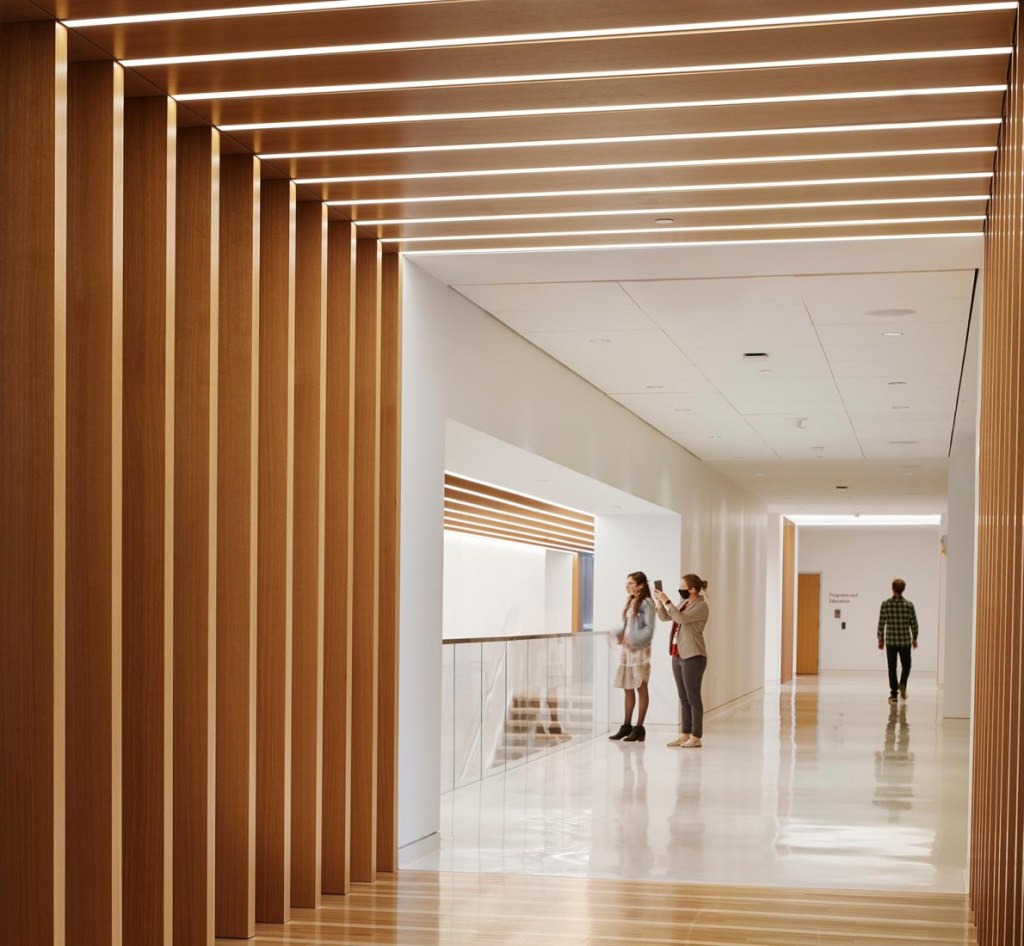 Los nuevos edificios de facultades de la escuela de secundaria de la Academia Greenwich de Connecticut (2002) se integran perfectamente en el campus con sus construcciones de madera y cristal.