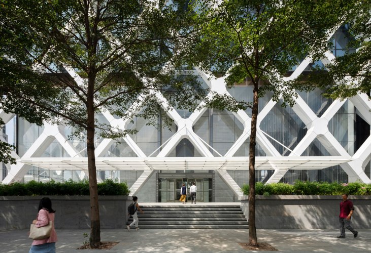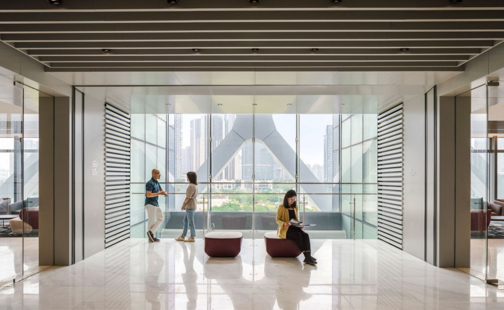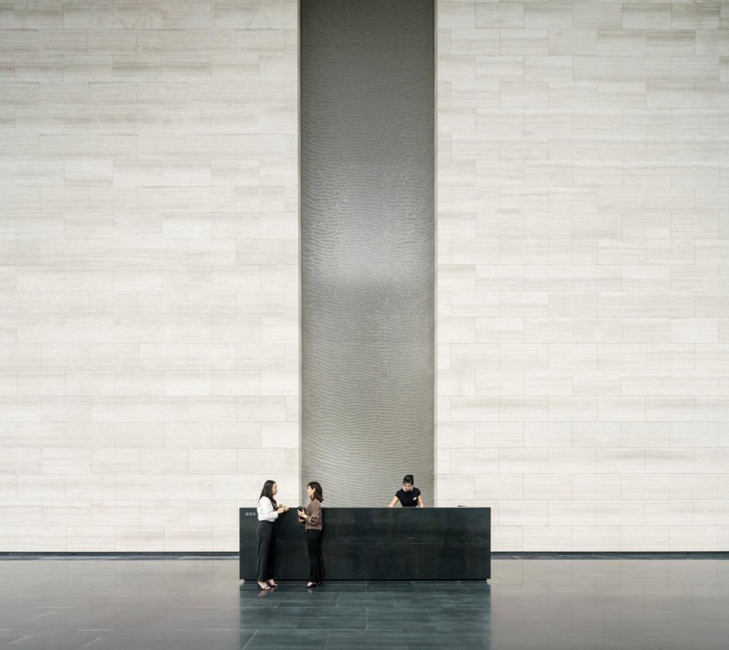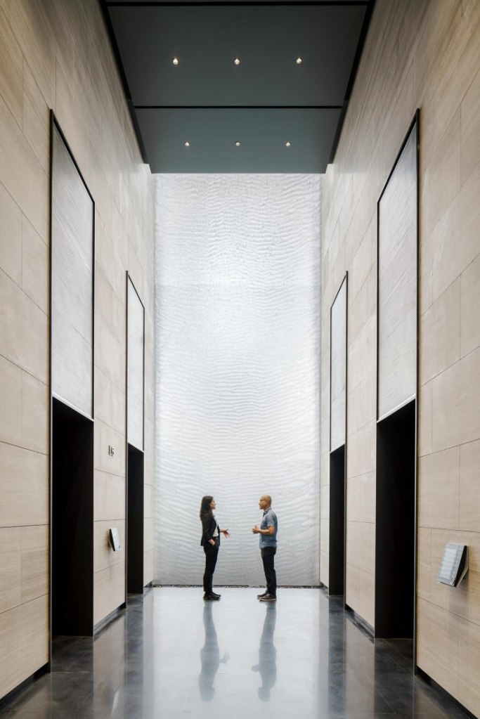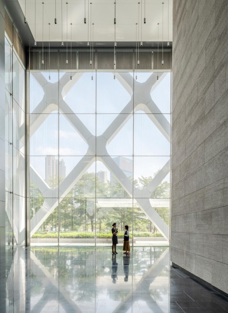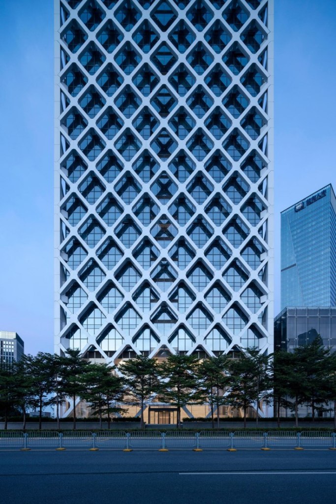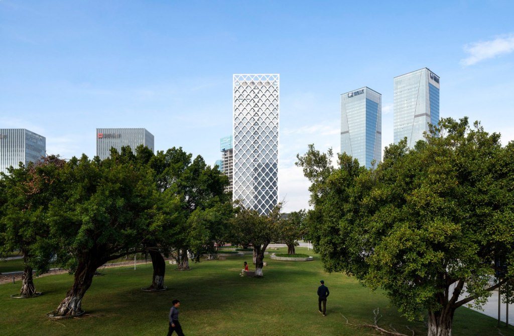 La firma de arquitectura Skidmore, Owings & Merrill (SOM) acaba de terminar la nueva sede del Shenzhen Rural Commercial Bank, una torre de 158 metros de altura y 33 pisos, situada al borde de un parque público en el centro de Bao’an, uno de los principales distritos comerciales de Shenzhen.La estructura de la torre de oficinas fue proyectada con un exoesqueleto exterior de acero, que también es un elemento de protección solar parcial (según el estudio, reduce la ganancia de radiación solar en aproximadamente un 34%), respondiendo al clima tropical de la región a través de una serie de Soluciones de diseño biofílico y sostenible.SOM recibió el encargo de Shenzhen Rural Commercial Bank en 2012 para diseñar una nueva sede que fusionara su pasado con su visión para el futuro.La fachada de la torre está definida por una diagrid externa, que actúa como estructura del edificio y como elemento de protección solar. En su base, la diagrid se ensancha para crear aberturas enmarcadas y vistas del parque circundante y el cercano Mar de China Meridional. «La sede del Banco Comercial Rural nos brindó la oportunidad de incorporar una cuadrícula, similar a un exoesqueleto, que tira de la estructura hacia el exterior y suspende efectivamente la torre en el interior para crear espacios de trabajo sin columnas.» Scott Duncan, socio de diseño de SOM.El diseño se basa en principios del Feng Shui, en los que el agua y la riqueza están intrínsecamente vinculados. El vestíbulo está rodeado por una piscina reflectante y cuenta con una pared de agua adyacente a la entrada principal. Una «cortina de lluvia» de 15 metros de altura, en la que gotas de agua caen en cascada por pequeños filamentos translúcidos, recubre las paredes de vidrio del vestíbulo. Estas características de agua proporcionan un efecto de enfriamiento por evaporación para todo el edificio.Junto con el agua, los elementos tierra y aire ocupan un lugar destacado en todo el edificio. Un sistema de ventilación natural trae aire fresco a las áreas comunes y espacios de oficinas.En la parte superior del edificio, las paredes operables y una plataforma al aire libre difuminan la división entre los espacios interiores y exteriores.