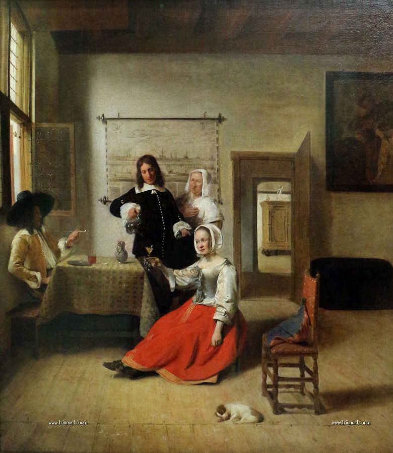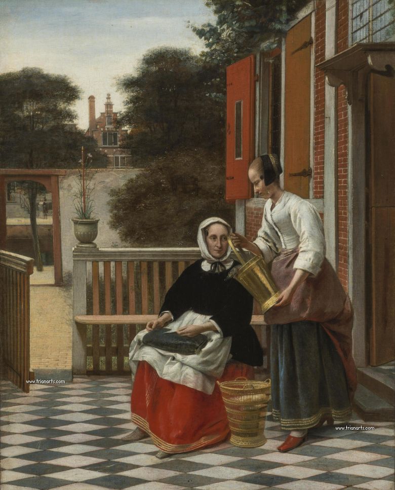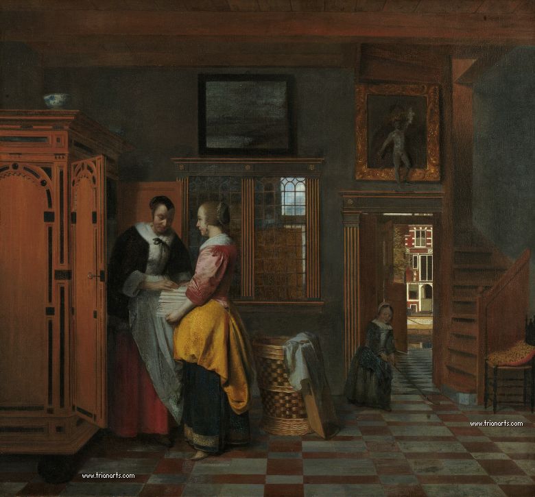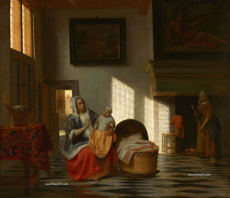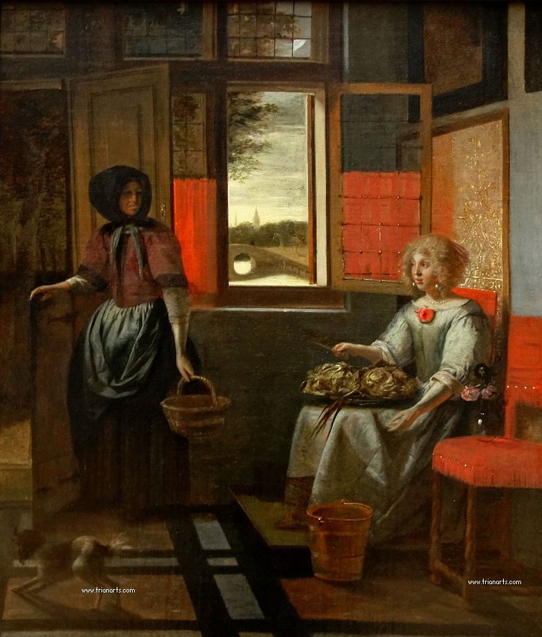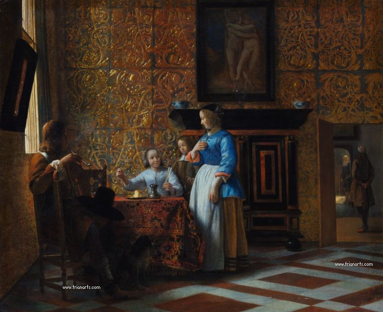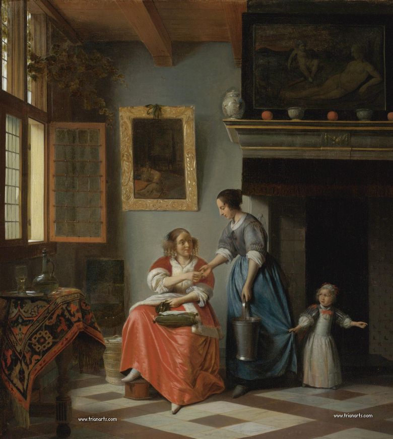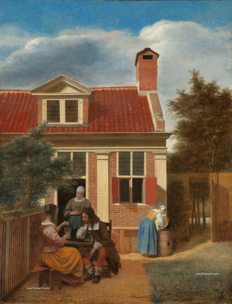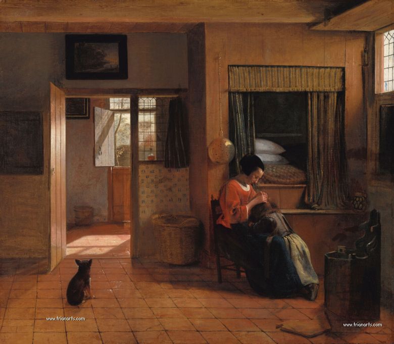 En este periodo cambió los temas de sus óleos por interiores burgueses de atmósferas cálidas, produciendo una serie de obras maestras como La despensa, del Rijksmuseum de Amsterdam, Doncella con un niño en un patio, de la National Gallery de Londres, y Hombre fumando y mujer bebiendo en un patio, de la Mauritshuis de La Haya.
