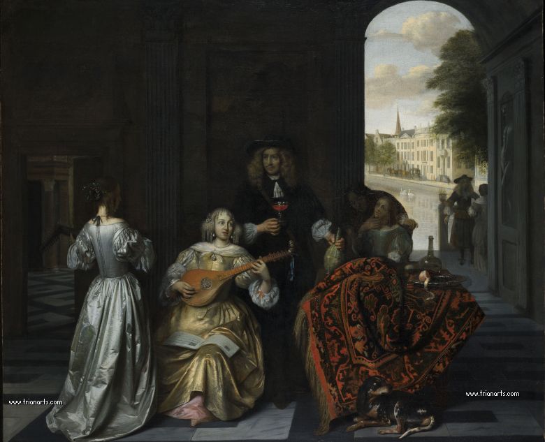 En este momento el gusto y la cultura francesa empiezan a inundar Europa, por lo que De Hooch al final de su carrera comienza a situar sus figuras en los marmóreos salones del Nuevo Ayuntamiento de la ciudad, ya que los hogares de la clase burguesa ofrecían pocos motivos para el esplendor.