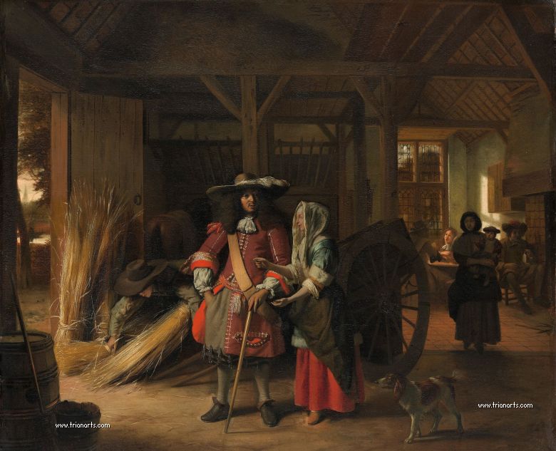 Pero, en los primeros lienzos, donde se representan escenas de tabernas y de soldados tratados con fuertes contrastes de claroscuro, sí se registra la influencia de Ludolf de Jongh, artista activo en la ciudad natal de Hooch.