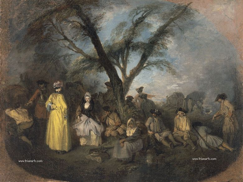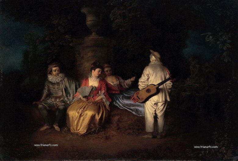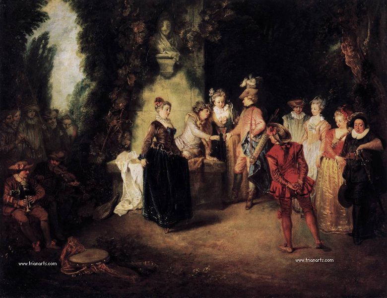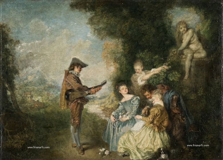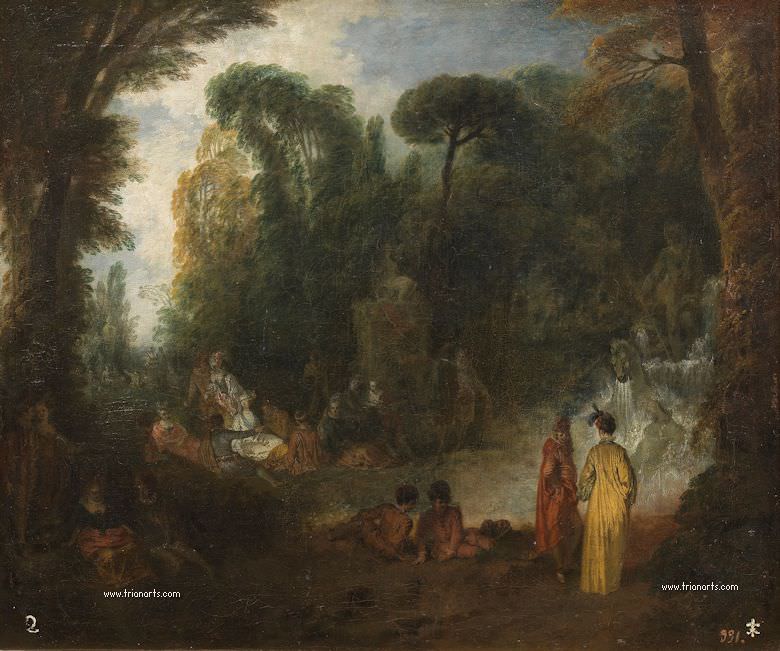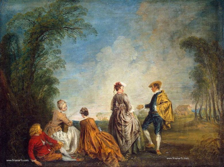 Watteau trabaja un género nuevo en el que la escena se desarrolla en la naturaleza y se mezcla con ella.