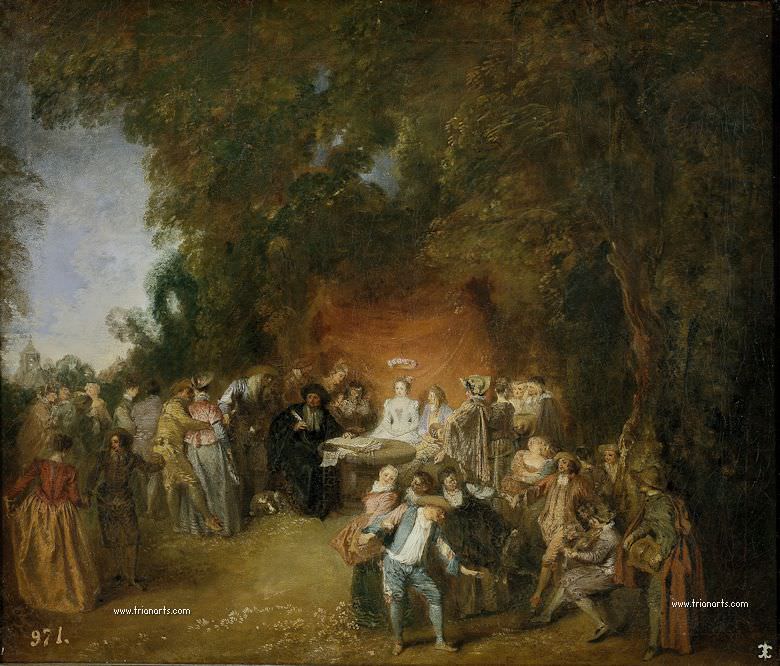 El escultor Rodin consideraba que Watteau representa una escena de teatro que encuadraba tres acciones sucesivas entra las parejas: proposición y súplicas del hombre a la mujer que duda lo que la hace parecer indiferente; aceptación de la amante convencida, y abandono de la pareja.