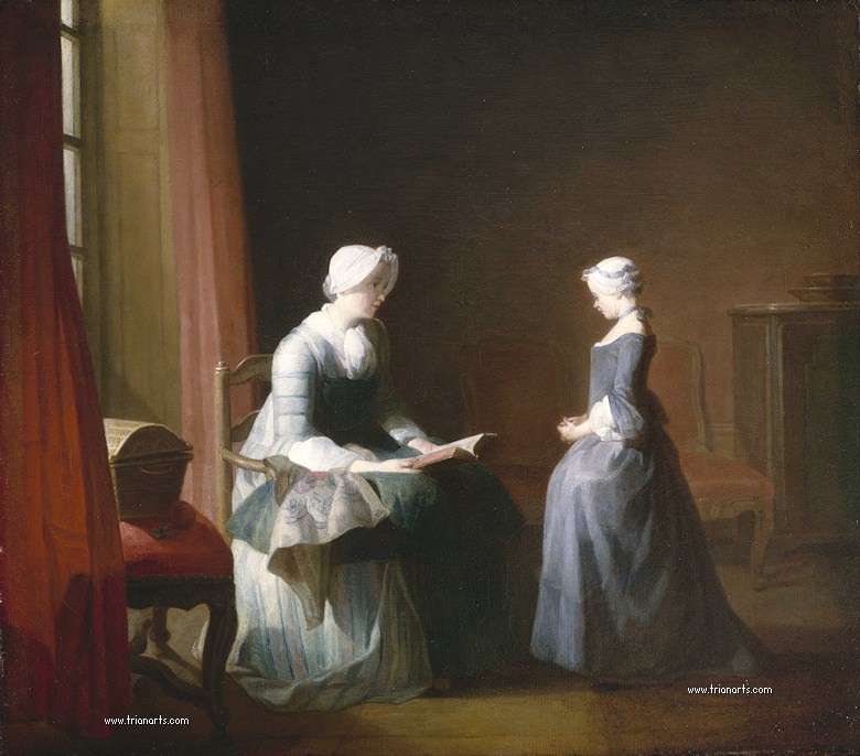 El tema de las labores de la casa es uno de los temas constantes y preferidos por el pintor, quien lo introduce en la pintura francesa del siglo XVIII.