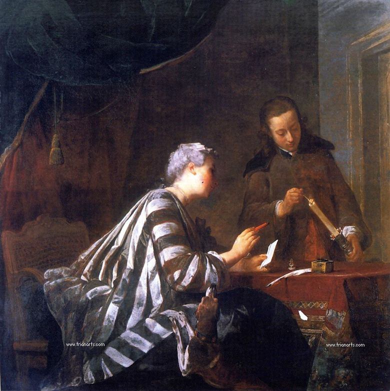 En 1734 presenta en la Exposición de la Juventud dieciséis cuadros, entre los que están una: Mujer lacrando una carta y Una Lavandera.