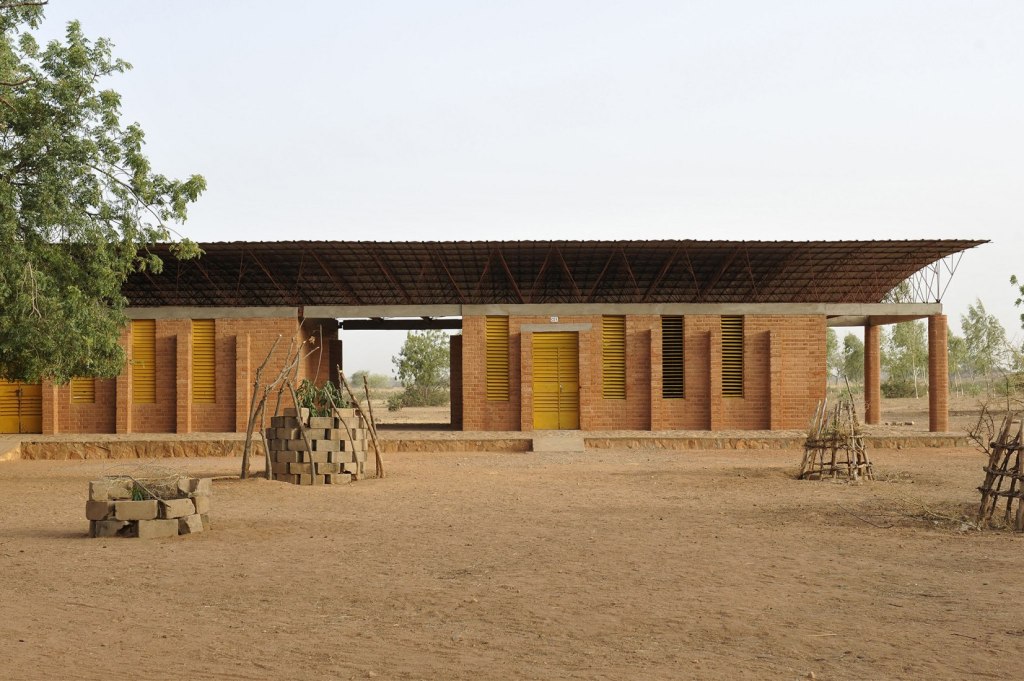 Un sencillo edificio en ladrillo con un techo elevado y ventanas con persianas de colores en las dos fachadas principales, elementos básicos para mejorar la ventilación. La escuela, un proyecto de la Fundación Kére, incrementa el número de alumnos de 120 a 700.