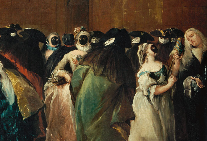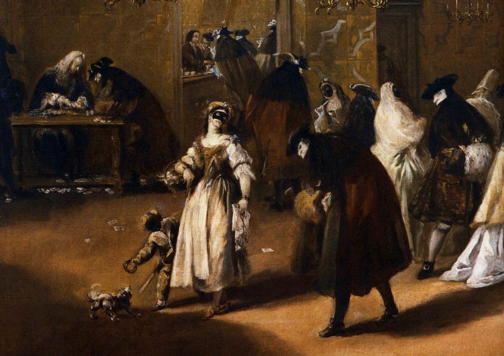 Al fondo hay mesas rodeadas de hombres con capas y máscaras, jugando dinero.