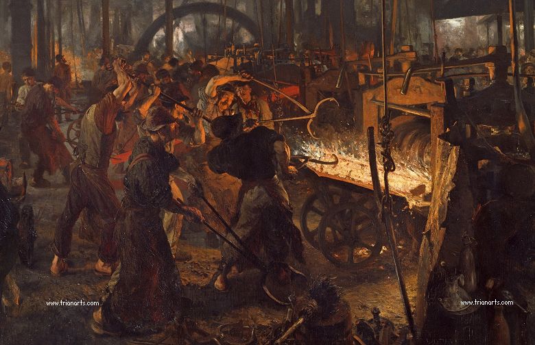 La composición aglomerada hace palpable el duro trabajo de la fundición del hierro. Este cuadro retrata la historia de la industrialización.