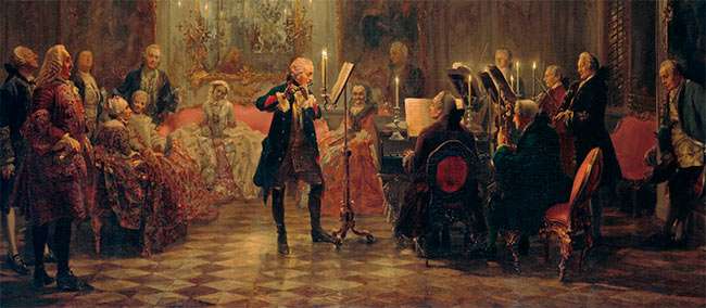 Adolph Menzel – Concierto de flauta de Federico II el Grande en Sanssouci (1850-1852, óleo sobre lienzo, 205 x 142 cm, Alte Nationalgalerie, Berlín)
