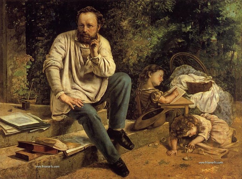 En el fondo, Proudhon con sus finas gafas por la filosofía social, Promayet por la música, Max Buchon por la poesía realista, Urbain Cuenot , un amigo íntimo de Courbet, y, en fin, Alfred Bruyas el mecenas de Montpellier.