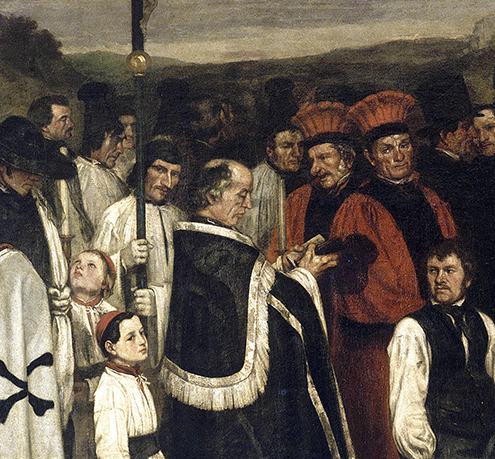 Delante, un rabino representa la religión hebraica y un segundo judío, el comercio. Este último ofrece una estola a un burgués, llevando un sombrero de copa, sentado. Este burgués podría ser quizá el abuelo de Courbet o, según Helene Toussaint, el banquero y ministro de economía Achille Fould recaudando en su cofrecillo la plata necesaria para el golpe de Estado.