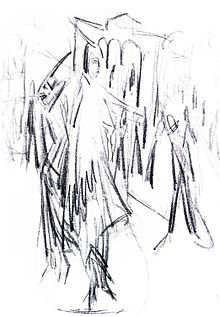 En esta imagen, el velo de la cabeza parece una jaula, lo que sugiere que Kirchner pretendía que el espectador de esta imagen comprendiera las contradicciones de la sociedad de la época, en la que, por un lado, los males sociales podían llevar a las viudas de guerra a la prostitución, pero por el otro.