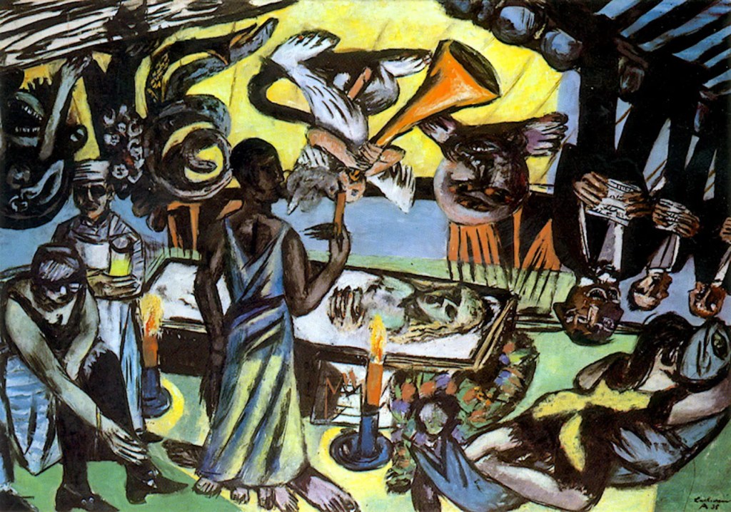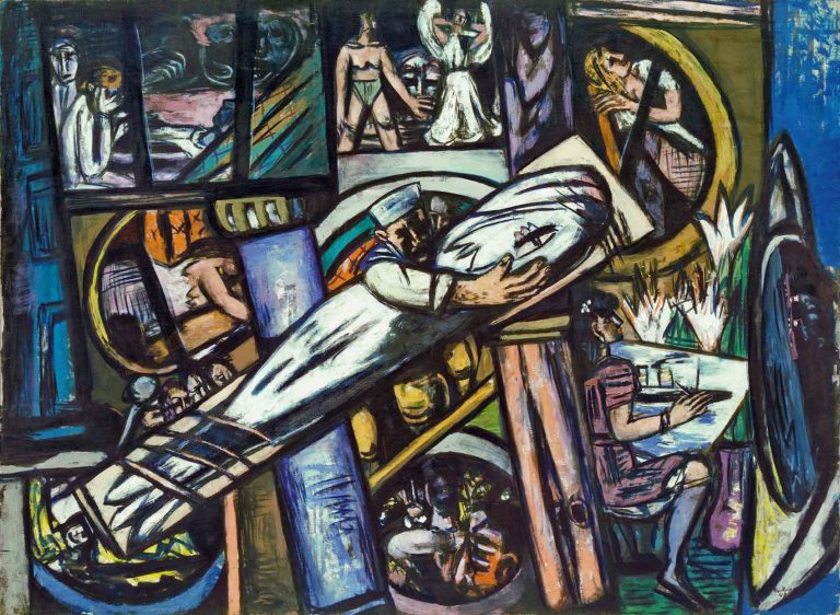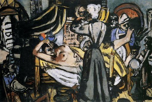 Temáticas antagónicas como un parto y velatorio, Beckmann las pinta con la misma composición y tamaño, y en las dos aparece, a modo de autorretrato, la figura de un médico con gorro y delantal.