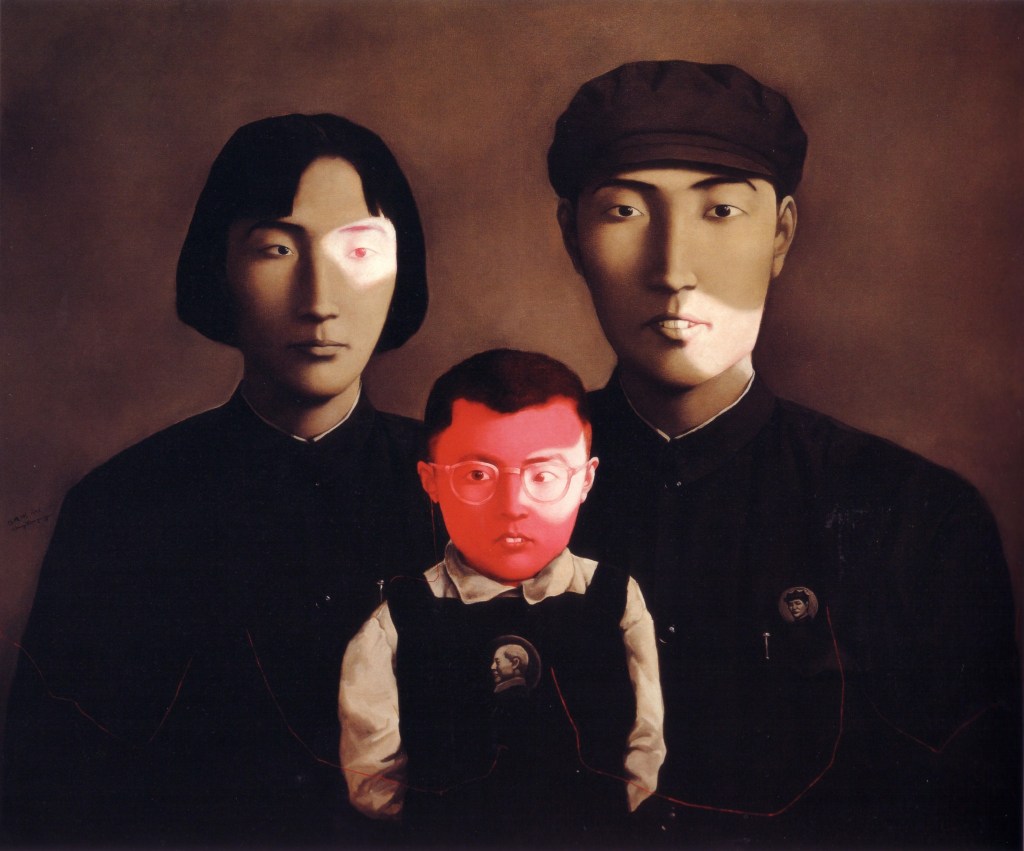 Two comrades with red baby es una de las series Bloodline: The Big Family de Zhang Xiaogang de China y actualmente se exhibe en la Galería Nacional de Australia.