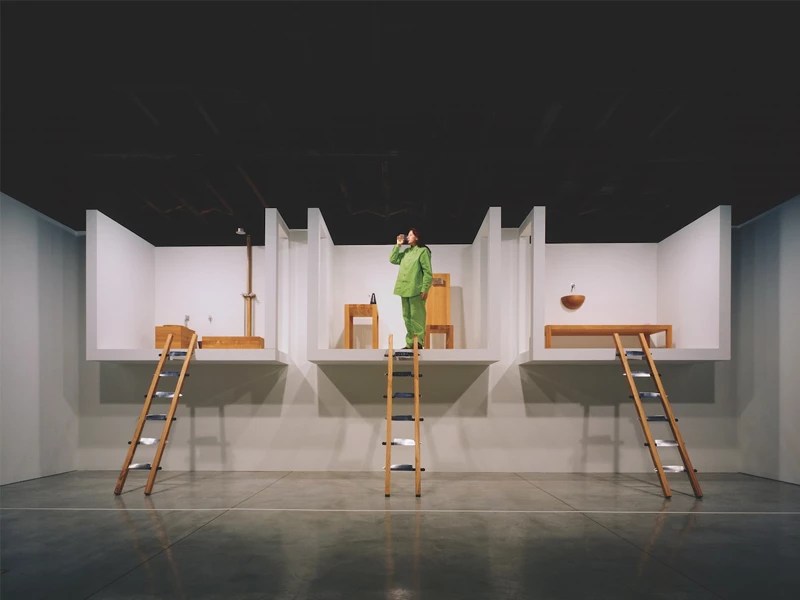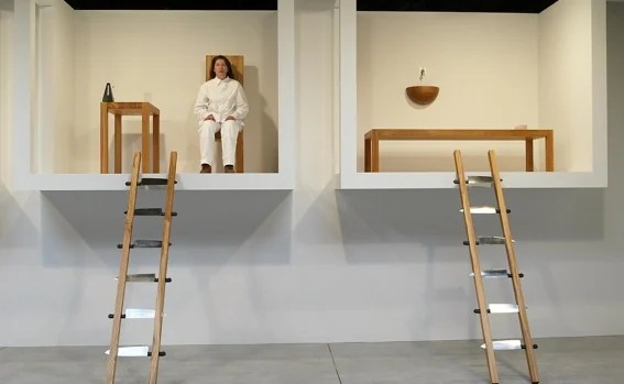 Tres cubículos blancos y elevados en el espacio central de la galería, intercomunicados entre sí, dotados de retrete y ducha el primero; una mesa, una silla y un metrónomo en el centro, y una cama y un grifo, el tercero.