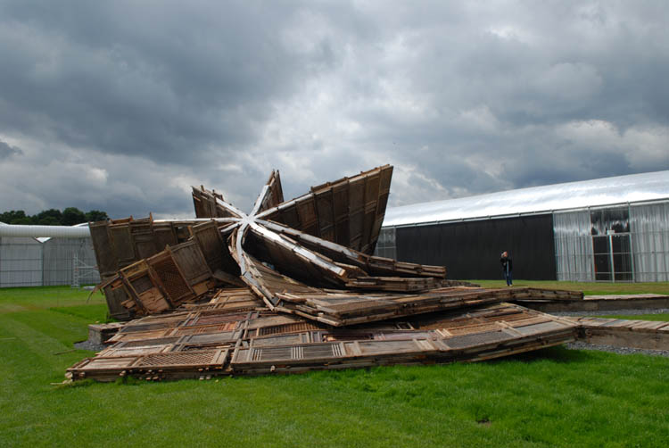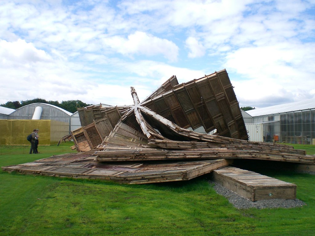 El diseño inicial bastante inestable, es anclado con sogas de acero, pero unas fuertes ráfagas de viento abaten la pieza.