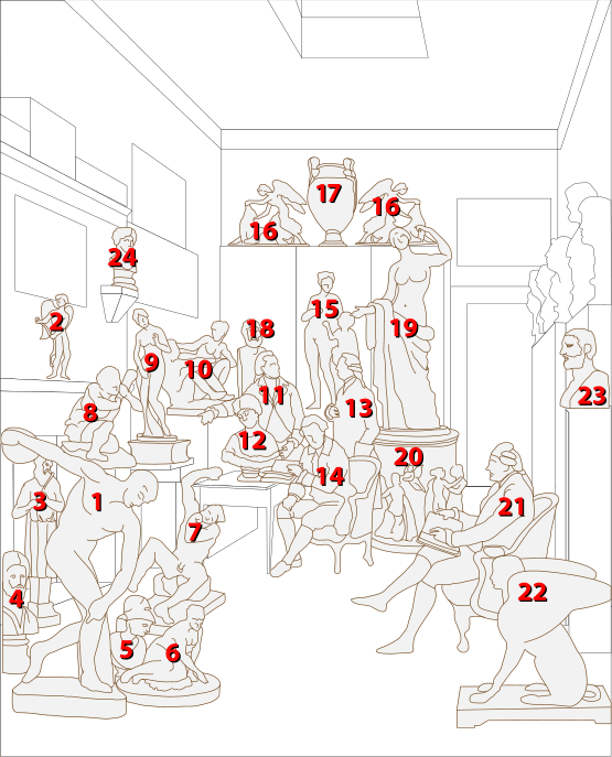 Se agolpan en la biblioteca las figuras de mármol que representan atletas, ninfas, diosas y bustos.