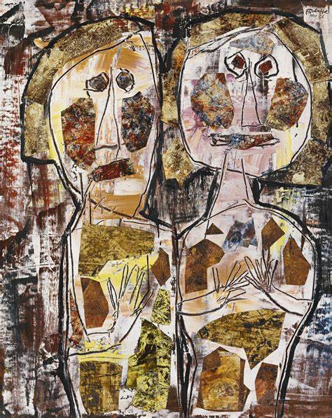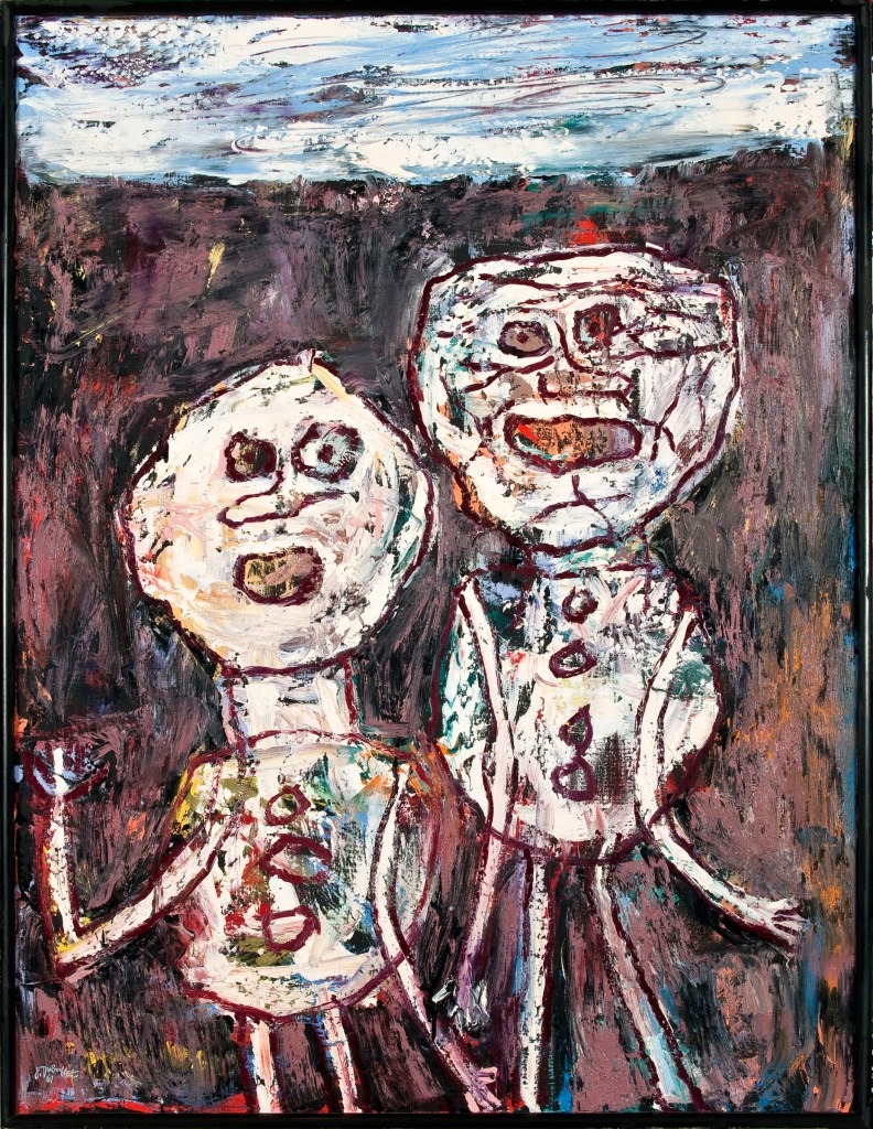 La superficie de la obra se nota rayada, frotada y manchada para dar forma al contorno de las figuras.