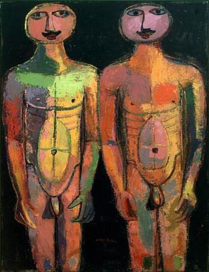 Las seis figuras, se distinguen mediante contornos elementales dentro de un empaste pictórico que contrasta con el fondo blanco.