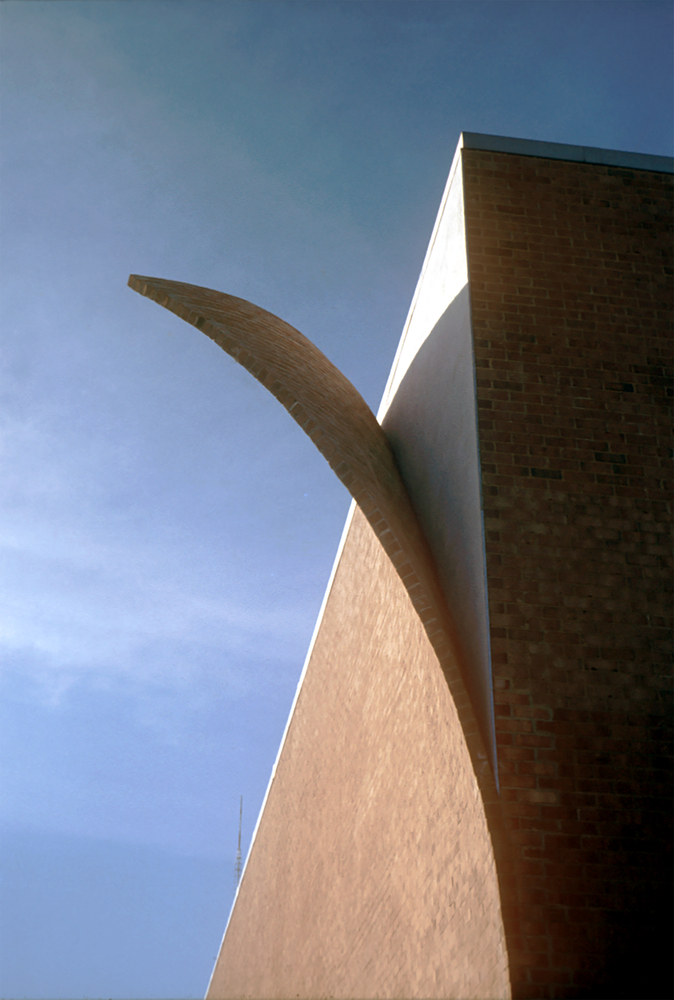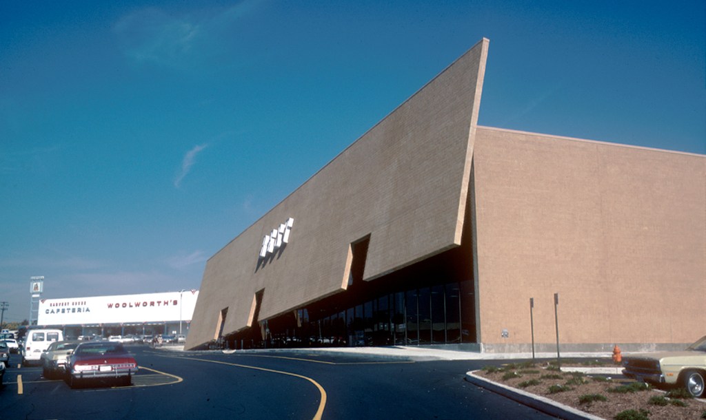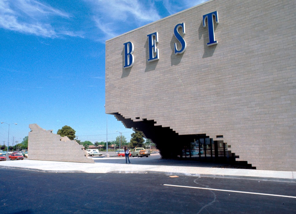 En el Notch Showroom del Arden Fair Shopping Center de Sacramento, California (1977), un ángulo del edificio alzado sobre rieles da lugar a la entrada.