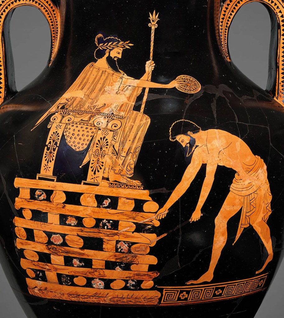 Creso de Lidia, en lo alto de una pira tras su condena a muerte por Ciro II. Ánfora ática. Siglo V a.C. Louvre, París. Foto: Tony Querrec / RMN-Grand Palais