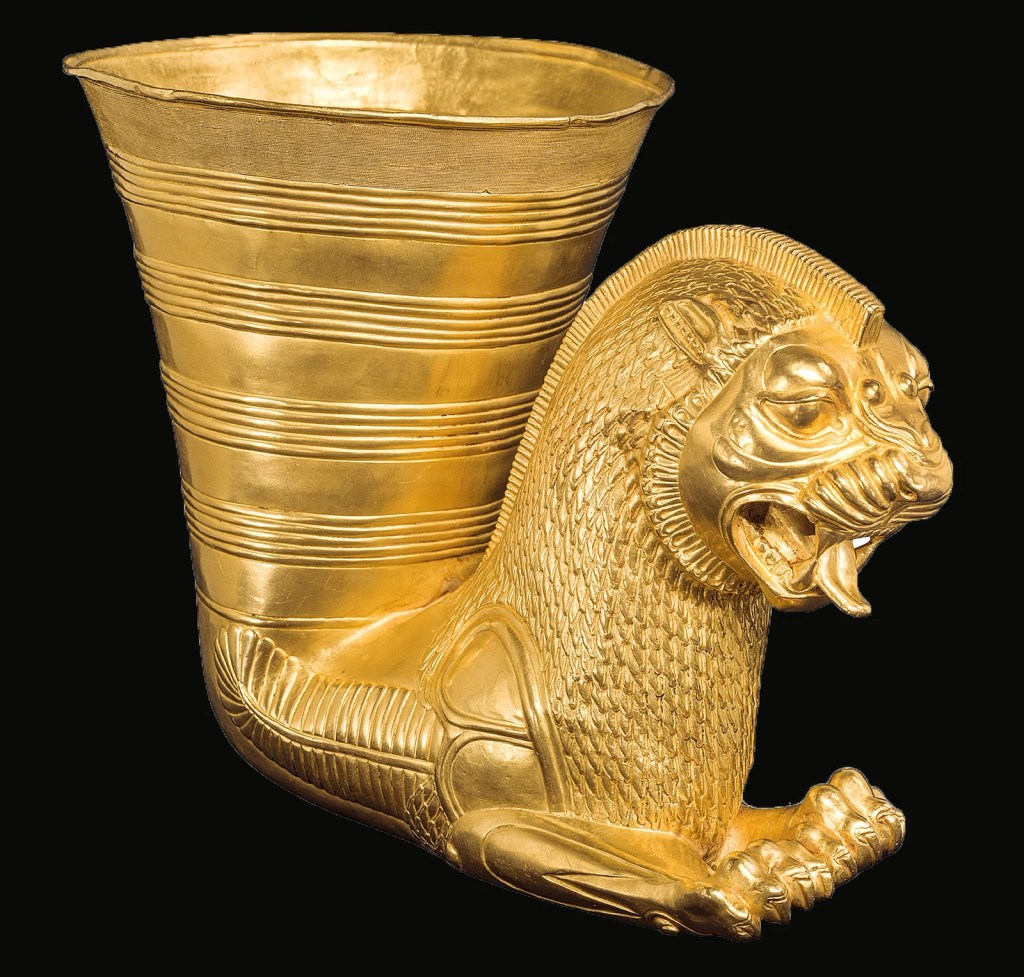 Ritón aqueménida de oro. Este recipiente destinado a contener líquidos y ornado con una cabeza de león se ha datado hacia el siglo V a.C. MET, Nueva York. Foto: Album.