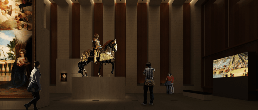 Las Colecciones Reales 170000 piezas son las más ricas de Europa, el legado que deriva del mecenazgo de la corona española durante cinco siglos. Para la Exposicion inaugural de la Galería se ha hecho una primera selección de 650 obras de arte. Hay cuadros, libros, abanicos, armaduras, instrumentos musicales, vajillas, esculturas… firmadas por El Greco, Velázquez, Goya, Caravaggio, La Roldana…