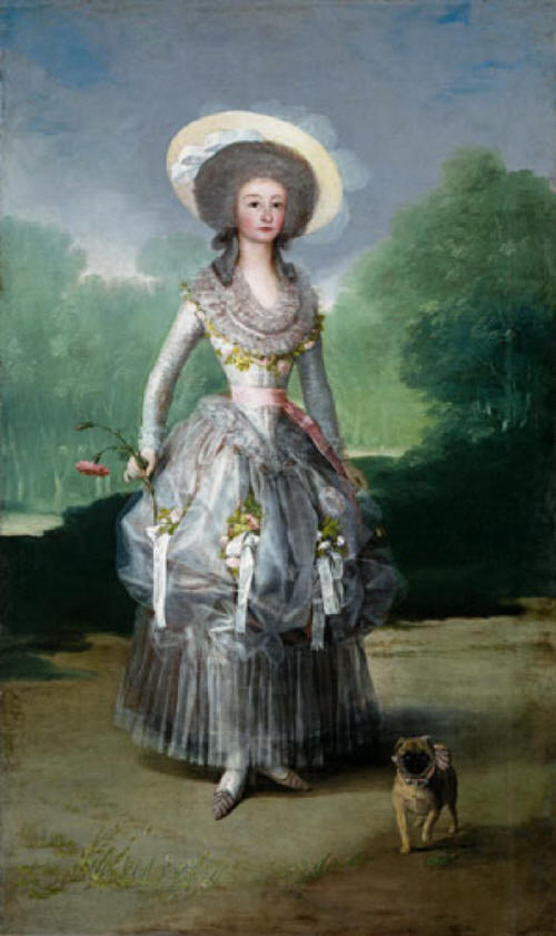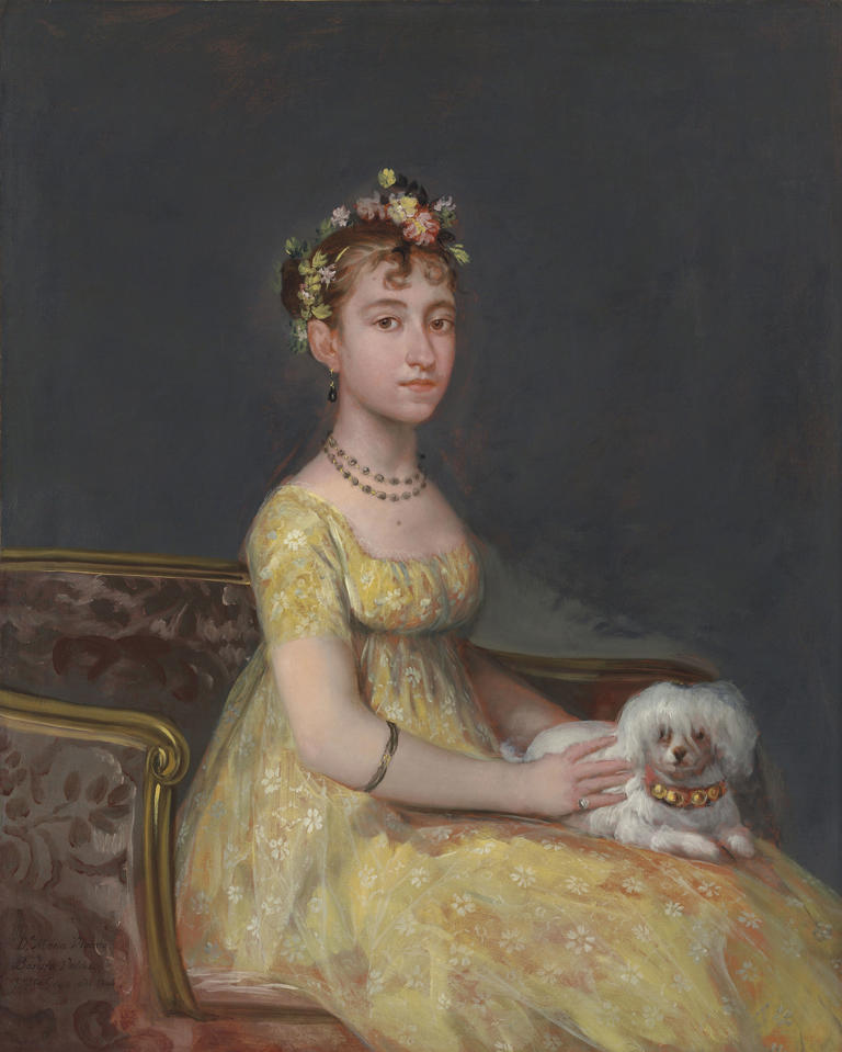 En su regazo, María Vicenta sostiene un pequeño perrito faldero que lleva un gran collar, adornado con grandes tachuelas doradas. Se trata probablemente de un bichón frisé, una raza popular entre las altas esferas de la sociedad española de la época. De hecho, varios perros muy similares aparecen en varios otros retratos de Goya, quizás el más famoso en el retrato de la duquesa de Alba vestida de blanco que se halla en la Colección de la Casa de Alba.