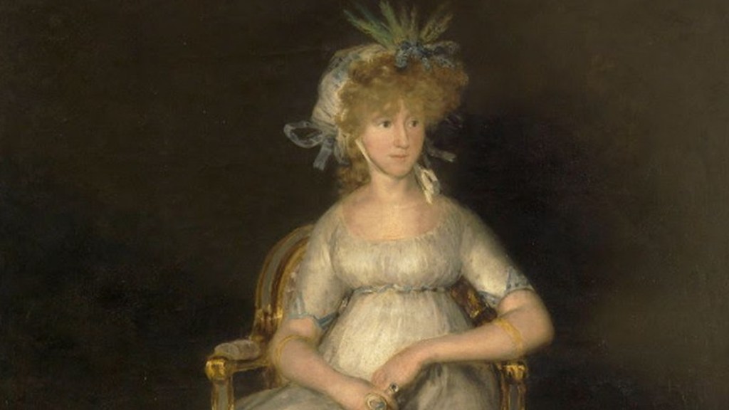 Doña Leonora tiene cuarenta y cinco años cuando Goya la retrata. Aparece sentada de una manera rígida y mirando de perfil fijamente al espectador. Viste un traje en tonos rosados de corte imperio con amplio escote que realza su busto prominente…