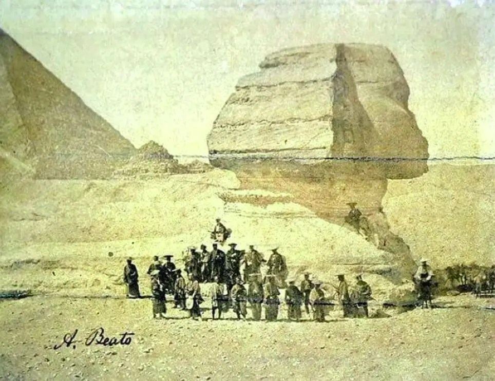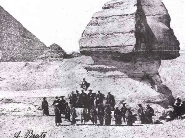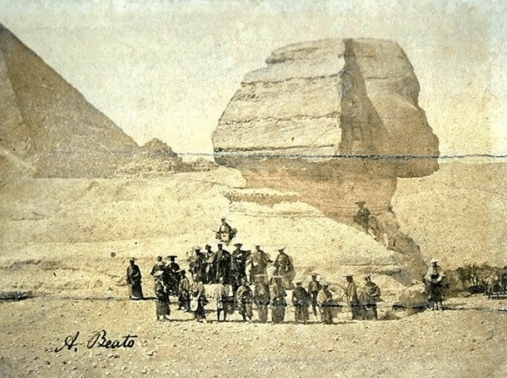 Hay una fotografía de 1864, que muestra a un grupo de samuráis japoneses de pie frente a la Gran Esfinge de Guiza en Egipto. Esta imagen durante décadas sorprende por la peculiar escena: ropa tradicional japonesa, el antiguo monumento egipcio y la tecnología de la fotografía.