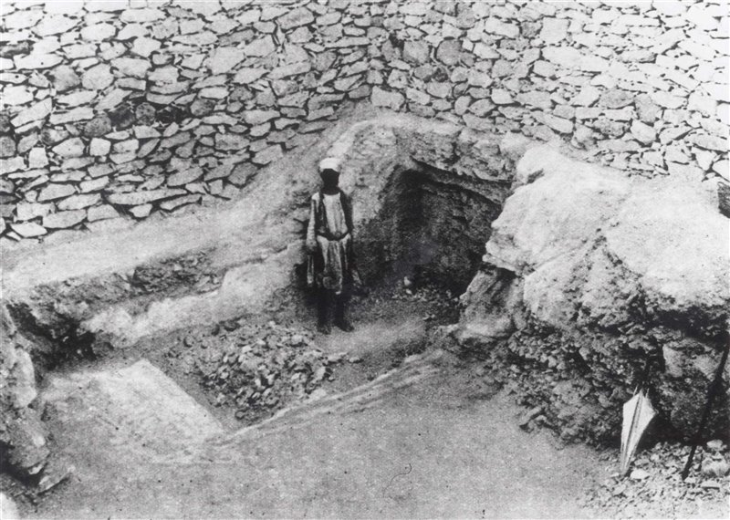 Tras más de 10 años de excavaciones en el Valle de los Reyes, el equipo liderado por Howard Carter y financiado por Lord Carnarvon estaba a punto de deshacerse. El noble inglés había abandonado toda esperanza cuando Carter le pidió una última oportunidad, justamente la que les cambió la vida a los dos. En aquellos días de gracia, un miembro del equipo de Carter encontró el primer escalón de lo que prometía ser una escalera de descenso en el lugar donde se tomó esta imagen con un miembro del equipo posando en ella. Después de las excavaciones de los siguientes días, se desenterraron más escalones de lo que posteriormente se reveló como la entrada a la tumba de Tutankamón.