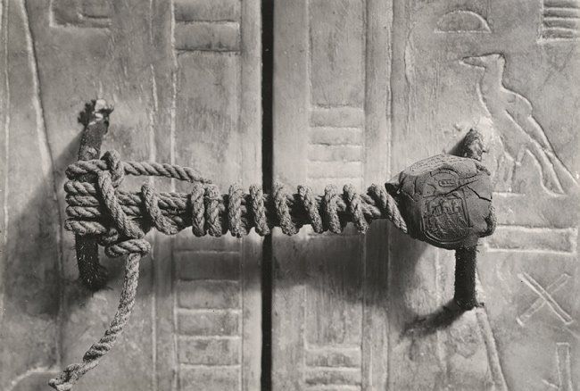 Este fascinante descubrimiento inauguró una nueva era de la arqueología, en gran parte gracias a Howard Carter y sus meticulosos métodos. Cada paso de la excavación se llevaba a cabo con mucho detenimiento de modo que los trabajos se iban alargando y no llegaron a la puerta de la cámara funeraria hasta febrero de 1923. Tras encontrarse con las dos famosas estatuas a tamaño real de los guardianes que custodiaban la entrada a la tumba, esta imagen apareció ante un entusiasmado equipo. Parecía que la puerta conservaba el sello que certificaba que el descanso de Tutankamón no había sido perturbado durante los últimos 3.000 años.