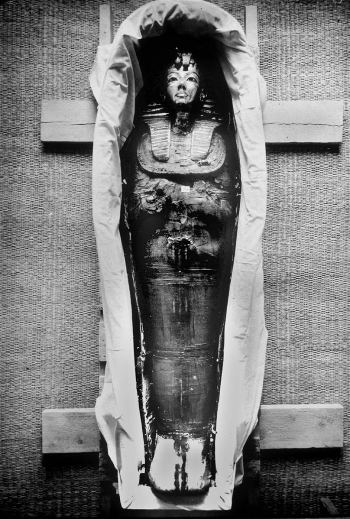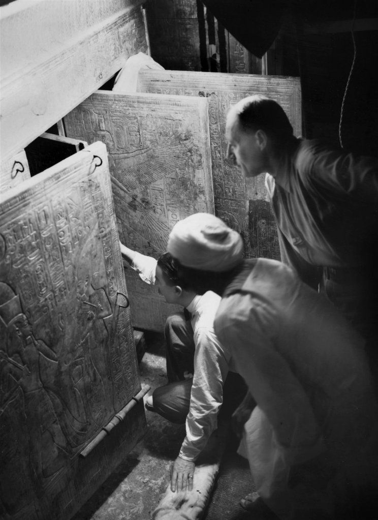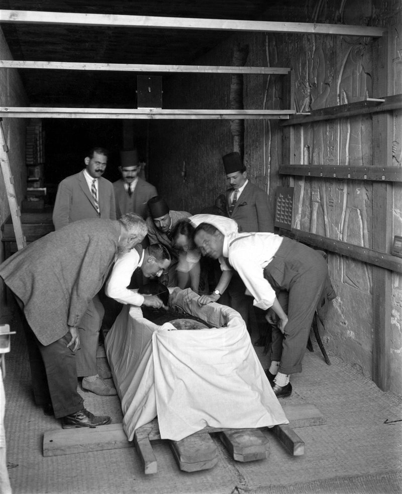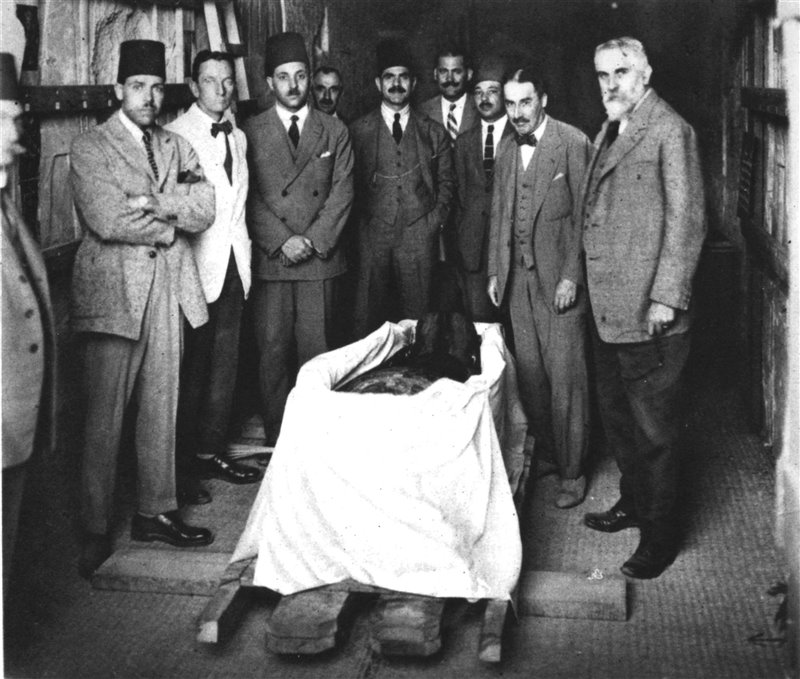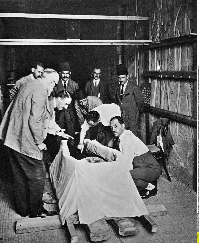 Carnarvon acudió para la apertura de la cámara funeraria, pero no pudo ver la del sarcófago, pues murió a causa de una sepsis dando alas a las teorías de la maldición del faraón. Carter siguió adelante, pero las autoridades egipcias cada vez se inmiscuían más en los trabajos de excavación y Carter detuvo la investigación como medida de protesta. La excavación estuvo parada hasta 1925, cuando se reanudaron los trabajos y por fin se procedió a la apertura del sarcófago, de los ataúdes y al desvendaje de la momia, un proceso que se alargó hasta siete días y que fue supervisado por dos expertos anatomistas que aparecen en la imagen justo a la izquierda de Carter: el Prof. Douglas Derry y el Dr. Saleh Bey Nandi. Merece la pena destacar la importancia de las fotografías de Harry Burton, quien en 1922 era considerado el fotógrafo arqueológico más importante del mundo. Gracias en parte a sus evocadoras imágenes, el descubrimiento y la excavación se convirtieron en un acontecimiento mediático mundial.