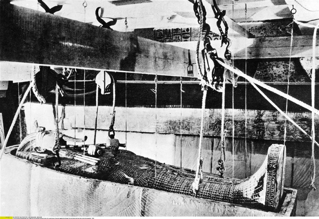 Uno de los momentos más delicados del examen de los ataúdes fue la extracción de estos del enorme sarcófago de piedra en el que estaban albergados. Arthur Callender, un amigo de Carter e ingeniero, inventó un sistema de poleas como el que se puede ver en la imagen y que permitieron extraer las pesadas cajas de manera delicada y sin dañarlas. En la fotografía había quedado a la vista el segundo ataúd, tras el tercero se hallaba la momia de Tutankamón coronada por su célebre máscara funeraria. Muchas de las piezas estaban bañadas o recubiertas de oro, pero el último ataúd era de oro macizo y pesaba 110 kilos.
