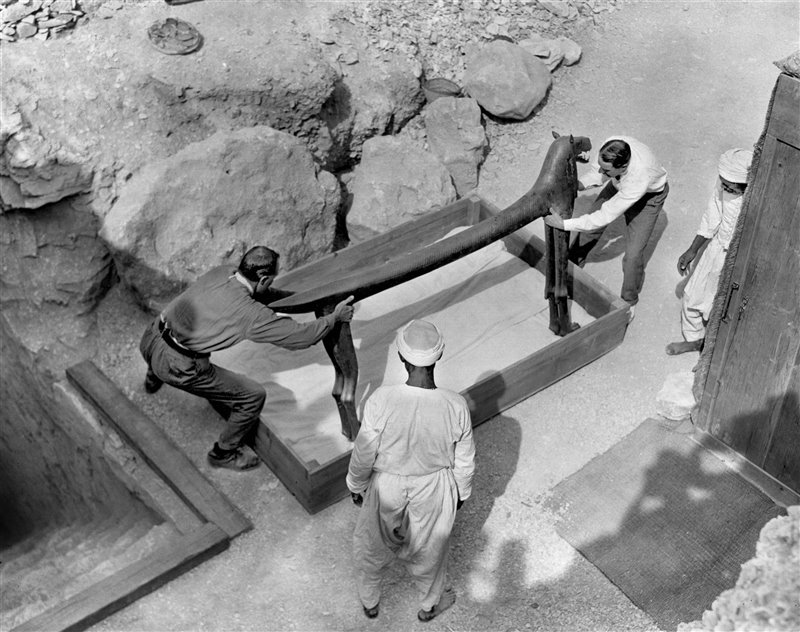 Aunque todavía no se había llegado hasta el final de la tumba ni se habían abierto todas las cámaras, a finales de noviembre de 1922 la cantidad de piezas y objetos recuperada era sencillamente espectacular, de modo que al mismo tiempo que progresaba la excavación se procedía a la extracción de piezas desde el interior. Al final de la excavación completa de la tumba se habían desenterrado un total de 5.400 objetos y piezas. En la imagen se puede ver a un miembro del equipo de Carter cargando un busto que se cree pudo ser un maniquí, encontrado en la Antecámara, con el arqueólogo en el extremo derecho de la fotografía. La repercusión del descubrimiento hizo que muchos medios y periodistas se desplazaran hasta el lugar para cubrir la noticia.