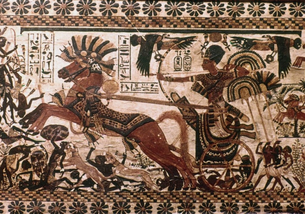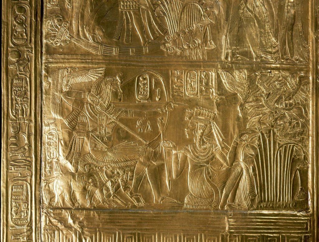 Escena que decora la naos dorada de Tutankamón. En ella, el rey está a punto de disparar un arco, mientras su esposa le tiende una flecha. Museo Egipcio, El Cairo.Foto: Cordon Press