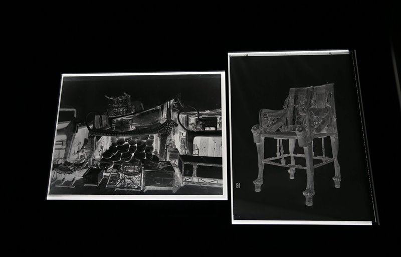 Dos de los negativos originales de Harry Burton. A la izquierda, una fotografía de la Antecámara, y a la derecha, el trono dorado del faraón.
