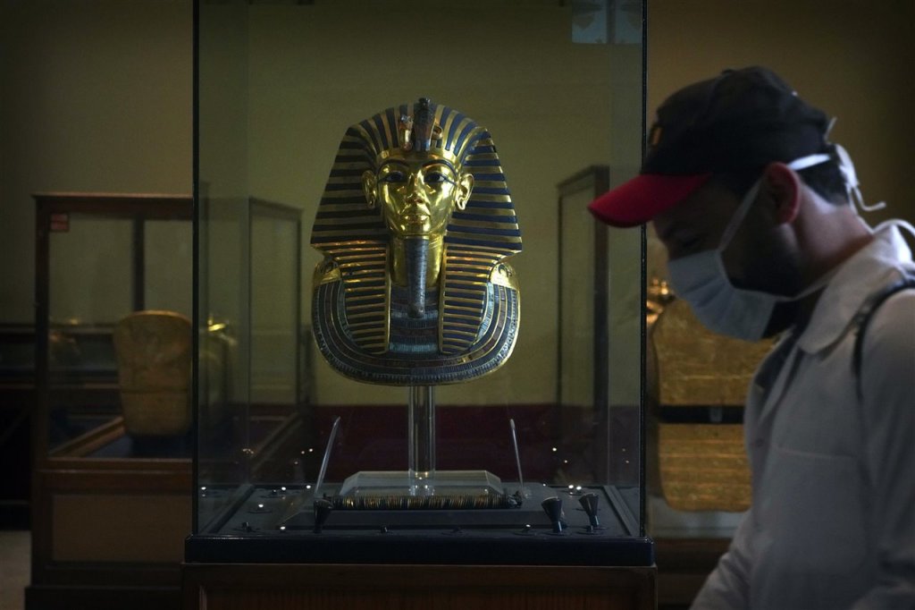 Un trabajador del Museo Egipcio realiza labores de desinfección junto a la máscara de Tutankamón.Foto: AP